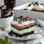 Keywords: Mint Chocolate Lasagna, Mint Oreo Crust, No-Bake Cheesecake, Chocolate Pudding, No-Bake Dessert, Mint Chocolate Dessert