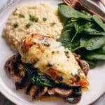 This Mushroom Stuffed Chicken Breast recipe features tender chicken breasts filled with a flavorful mixture of sautéed mushrooms, garlic, thyme, and baby spinach, topped with melted mozzarella cheese. The chicken is seared in a skillet before being baked to perfection, resulting in a juicy, aromatic dish that pairs wonderfully with creamy risotto or a fresh salad.