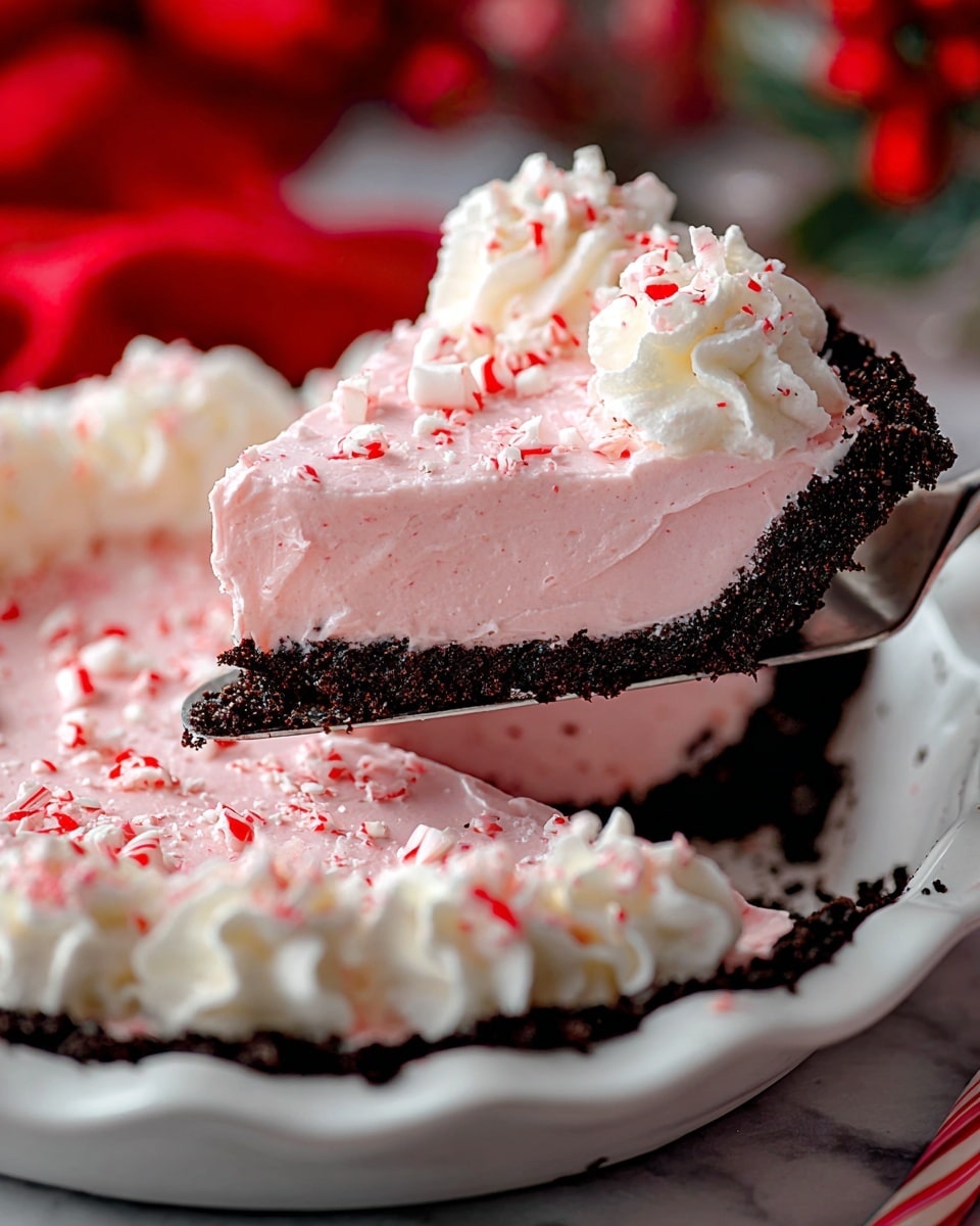For a party, I’ve served this pie in individual mini parfait glasses layered with whipped topping and peppermint pieces—it’s a showstopper and so easy for guests to grab without needing plates. Another time, I swirled a little red syrup on top for a candy cane-inspired design that got tons of compliments.