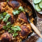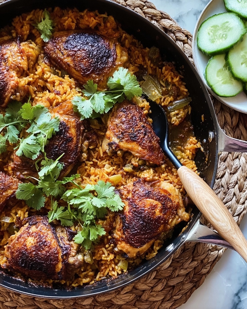 For special occasions, I’ve served the chicken and rice in a beautiful rustic clay pot right from stove to table—it looks stunning and keeps everything warm longer. You can also plate it family-style, scooping generous portions of rice and placing the chicken on top, then finishing with a generous drizzle of lemony cucumber salad around the edges.