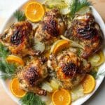 Place the marinated chicken on top of the fennel and shallots. Thinly slice the navel oranges and scatter the slices around and on top of the chicken. The oranges will roast down, adding moisture and a fresh citrus punch. Roast in a preheated oven at 425°F (220°C) for about 1 hour to 1 hour 15 minutes, basting occasionally with pan juices. I usually check the internal temperature at the thickest part of the thigh; 165°F (74°C) means it’s perfectly done. Let the chicken rest for 10-15 minutes before carving to keep it juicy.