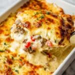 Keywords: Philly cheesesteak casserole, sirloin steak casserole, cheesy casserole, comfort food, American casserole