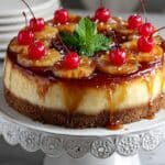 A luscious Pineapple Upside-Down Cheesecake that combines the tropical sweetness of caramelized pineapple rings with a creamy, rich cheesecake layer atop a buttery graham cracker crust. This dessert is baked in a water bath for a smooth texture and perfectly set filling, finished by inverting to reveal a stunning pineapple topping adorned with cherries.