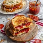 This Pizza Grilled Cheese recipe combines the cheesy comfort of a classic grilled cheese sandwich with the bold flavors of pizza. Featuring melted mozzarella and Parmesan cheeses, savory turkey pepperoni, and a zesty marinara sauce, all layered between seasoned, buttery toasted bread, this quick and easy sandwich is perfect for a satisfying lunch or dinner.