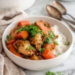 Now, stir in the carrots, potatoes, and olives if you’re using them. Cover again and simmer for another 20-30 minutes, until the veggies are tender and the chicken is easily sliding off the bone. Lastly, uncover and let the stew reduce for 5-10 minutes, stirring occasionally, until it thickens to your preferred consistency. Don’t forget to taste and adjust salt, pepper, or add a squeeze of lime for a fresh pop at the end.