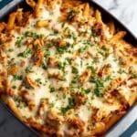 Once your pasta is ready, drain it and add it straight into the pan with the sauce and chicken. Give it a good stir so every piece is coated. Sprinkle mozzarella or your Italian cheese blend on top, then turn off the heat. The residual warmth melts the cheese perfectly, but if you want to up the game, pop the pan under a broiler for a few minutes until the cheese bubbles and turns golden—and honestly, that’s my favorite touch. Finish with a sprinkle of Parmesan for extra flair.