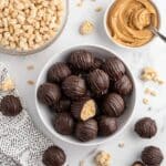 Because these are best enjoyed cool, I usually don’t reheat. Instead, I let frozen balls thaw in the fridge for several hours. If you want slightly softer peanut butter inside, just leave them at room temperature for 15-20 minutes before indulging.