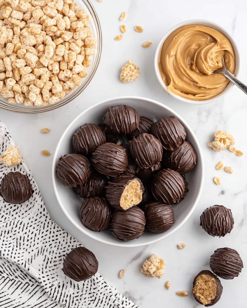 Delicious and easy-to-make Rice Krispies Peanut Butter Balls coated in rich dark chocolate. These no-bake treats combine creamy peanut butter, crispy cereal, and sweet powdered sugar for a perfect snack or dessert.