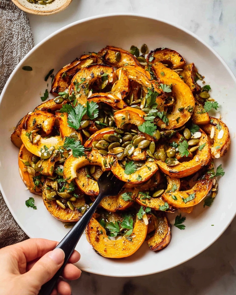 Lay the roasted delicata squash on a serving platter. Drizzle the warm brown butter sauce over the top and scatter toasted pepitas and chopped parsley for freshness and crunch. Finish with an extra sprinkle of flaky sea salt—this final touch will make every bite sing.