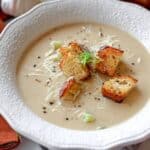 This Roasted Garlic Soup is a comforting, creamy blend of roasted and raw garlic cloves simmered with onions, thyme, and chicken broth, then finished with cream and Parmesan cheese. The warming flavors are enhanced by optional garnishes like toasted croutons, Parmesan crisps, or sautéed garlic, making it a savory, aromatic soup perfect for garlic lovers. The roasted garlic adds a mellow sweetness and depth, while the fresh garlic delivers a sharper note. A touch of lemon juice brightens the dish for a balanced finish.