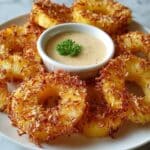 Keywords: Fried pineapple, rum-soaked pineapple, coconut flakes, tropical dessert, coconut rum dessert, pineapple rings, cream cheese dip