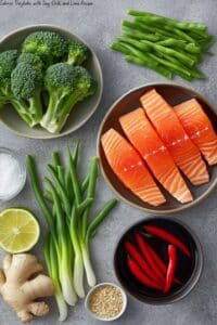 These ingredients work beautifully together to create a fresh, tangy glaze and perfectly cooked salmon. When shopping, I always look for bright, crisp veggies and the freshest salmon I can find. Using fresh lime and proper ginger makes a world of difference here – the flavors really sing.