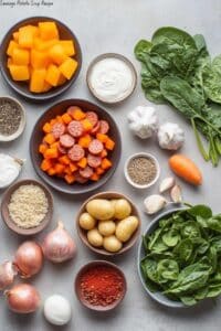 Each ingredient in this Sausage Potato Soup Recipe plays a key role in building that depth of flavor you’re aiming for. From the spicy sausage to the creamy finish, here’s what you’ll want on hand—and a few shopping tips to get the best results.