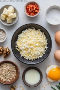- Combine Oats and Cheese: Once oats are cooked, stir in the shredded white cheddar cheese while oats are still warm. Mix until cheese is melted and evenly distributed. Adjust salt and pepper to taste.