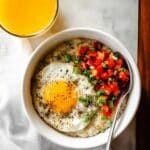 - Assemble the Dish: Spoon the cheesy oats onto a serving plate or bowl. Top with the sautéed red pepper and onions. Place the fried egg on top.