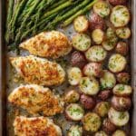 Keywords: sheet pan dinner, parmesan chicken, garlic chicken, roasted asparagus, roasted baby potatoes, easy chicken recipe, one pan dinner