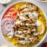 - Serve: Serve the sliced chicken shawarma over yellow rice with yogurt sauce and your choice of optional toppings such as pita bread, Arabic pickles, pickled turnips, hummus, olives, tomatoes, red onion, and lettuce. Alternatively, assemble in pita bread for a delicious wrap.