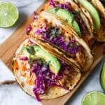 While the chicken cooks its magic, shred your red cabbage, chop the cilantro, slice your avocado, and cut your lime wedges. Having these ready ahead makes assembly smooth and fun. I squeeze half a lime over the cabbage with kosher salt to make a quick slaw that adds a refreshing crunch to every taco.