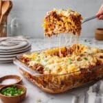 - Add Cheese Topping: Sprinkle the shredded mild cheddar and Monterey Jack cheese evenly over the top layer of the casserole.