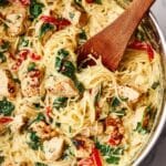 This Spaghetti Squash Cacio e Pepe recipe offers a healthy and flavorful twist on the classic Italian pasta dish by using spaghetti squash instead of traditional pasta. Tender roasted spaghetti squash strands are combined with sautéed chicken, creamy garlic sauce, sun-dried tomatoes, and fresh baby spinach for a comforting and nutritious meal packed with flavor.