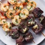 If you want to freeze portions, I recommend freezing the marinated steak and shrimp before threading and grilling. This way, you can thaw and grill fresh whenever you’re ready. I’ve found freezing cooked kabobs tends to change the texture, especially for shrimp.