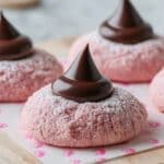 Keywords: Strawberry cookies, Hershey’s Kiss cookies, cake mix cookies, cream cheese cookies, easy dessert, soft cookies