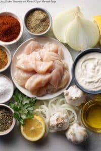 - Prepare the Marinade: In a large mixing bowl, combine the Greek yogurt, ground cumin, smoked paprika, cardamom, allspice, coriander, garlic powder, onion powder, kosher salt, black pepper, lemon juice, and olive oil. Stir well until all spices are fully incorporated into the yogurt base.