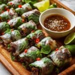 These Thai Basil Beef Rolls are fresh, flavorful, and perfect as a light appetizer or snack. Ground beef is sautéed with garlic, shallots, soy and oyster sauces, then combined with fragrant Thai basil and rolled in soft rice paper wrappers along with fresh herbs and crunchy vegetables. Served with a tangy dipping sauce, these rolls are a delicious fusion of savory, spicy, and fresh flavors ideal for any occasion.