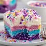 Keywords: Unicorn Poke Cake, layered cake, colorful cake, poke cake, vanilla pudding cake, festive dessert, birthday cake
