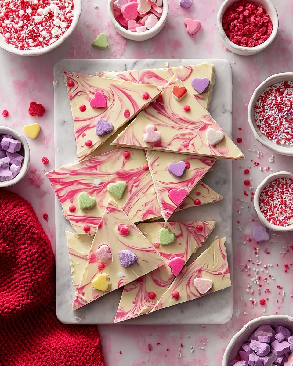 Keywords: Valentine’s Day chocolate bark, chocolate bark recipe, holiday chocolate treat, marbled chocolate bark, festive chocolate dessert