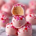 Using a fork or a dipping tool, dunk each chilled truffle into the melted coating. Tap off the excess gently against the bowl edge so the coating isn’t too thick and messy. Place the coated truffles back on the parchment paper immediately and sprinkle with your favorite Valentine’s sprinkles before the coating firms up. It’s important to move pretty quickly here because the coating sets fast!