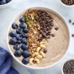 If you happen to have leftovers, I recommend storing the smoothie bowl mixture (before adding garnishes) in an airtight container in the fridge for up to 24 hours. It might thicken a bit, so give it a good stir and thin with a splash of plant milk before serving again. That said, I usually find it hard to save—it’s just too tasty!