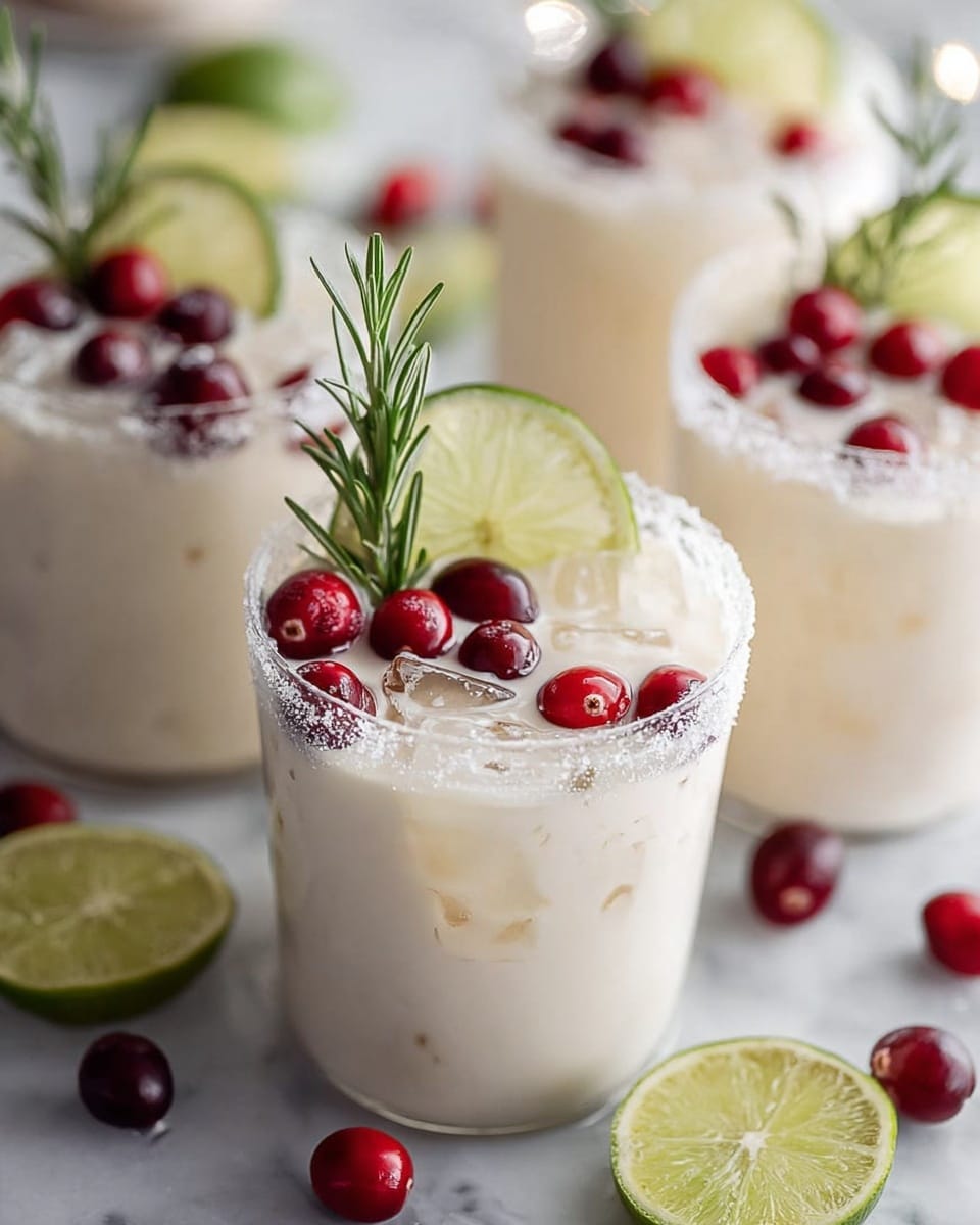 This White Christmas Margarita is a festive and creamy twist on the classic margarita, featuring tropical coconut milk and coconut water blended with silver tequila, Grand Marnier, fresh lime juice, and agave syrup. Garnished with cranberries, lime slices, and rosemary sprigs, it offers a refreshing and elegant cocktail perfect for holiday celebrations.