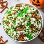 Witches’ Brew Popcorn is a fun and festive treat perfect for Halloween parties. This snack mixes crunchy popcorn with sweet white chocolate tinted green, crunchy pretzel sticks, gummy worms, and candy eyes to create a spooky yet delicious snack that’s easy to make and sure to delight guests of all ages.
